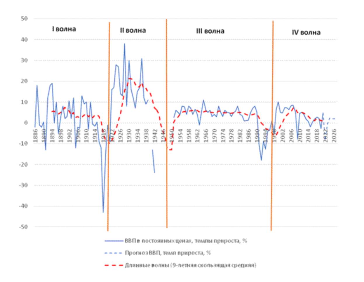 Рисунок 7 – Длинные волны Н. Кондратьева в соответствии с обработкой колебаний С. С. Кабановым, Е. Е. Францевой-Костенко [9]