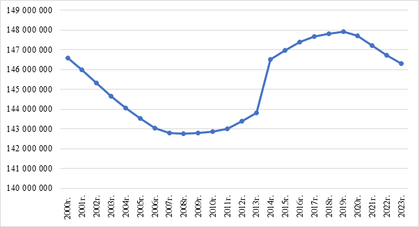 Если обратиться к «строительным циклам» С. Кузнеца, то необходимо отметить, что сам автор их связывал с демографическими колебаниями [26]. Автор говорил о том, что демографические всплески, которые возникают с определенной периодичностью, вызывают необходимость строительства жилья и инфраструктуры, и, поэтому сначала получает бурное развитие строительная отрасль, а за ней «по цепочке» идут все остальные. В России в 2010 году действительно наблюдалась самая низкая численность населения (рис. 8), что связано, прежде всего, с факторами рождаемости.