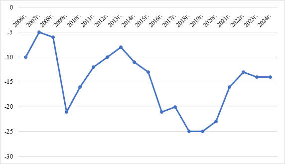 Рисунок 11 – Динамика индекса предпринимательской уверенности по общей оценки ситуации в строительстве (данные приводятся на 4-й квартал каждого года).