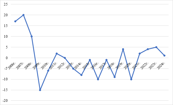Наконец, рассмотрим динамику индекса по общей оценки ситуации в строительстве (рис. 11). Как и в вышеприведенных случаях, баланс оценок изменения значения показателя, определяется, как разность долей респондентов, отметивших «благоприятная» и «неудовлетворительная» («улучшение» и «ухудшение») показателя (в процентах).
