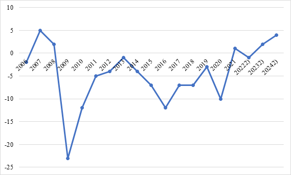 Если рассмотреть динамику темпов изменения производства в процентном соотношении, то можем увидеть провалы. Это кризисные состояния в отрасли (рис. 2). По графику можно увидеть циклы. Напомним, что экономический цикл измеряется от одного равноценного состояния экономики до другого. Скажем, от одного спада экономической конъюнктуры до другого спада, либо от одного подъема до другого. Всего же в классическом цикле выделяют четыре фазы: кризис, депрессия, оживление, подъем. В упрощенном варианте рассматривают две фазы: повышательную и понижательную волны [25].