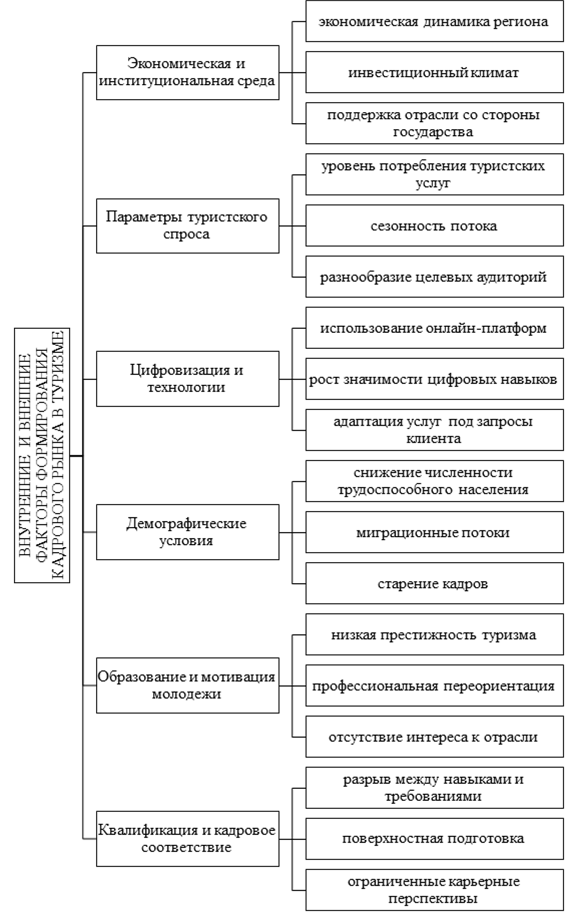 Рисунок 1. Факторы формирования рынка труда в туризме. (Составлено автором по данным источников [16; 17; 18; 19; 20; 21; 22; 23])
