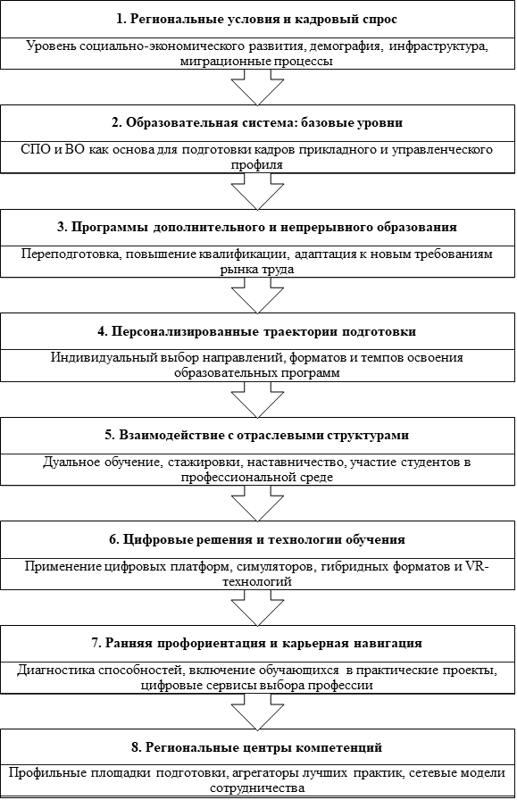 Развитие цифровых технологий позволяет существенно обогатить содержание профориентационных мероприятий. Проведение онлайн-встреч с представителями бизнеса, организация виртуальных туров по туристическим предприятиям, внедрение симуляционных тренажёров, воссоздающих реальные условия клиентского сервиса, делают подготовку будущих специалистов более приближенной к требованиям отрасли [35, c. 36]. Эффективность профориентационной работы может быть повышена при наличии региональной системы сопровождения профессионального выбора, включающей в себя центры диагностики и развития способностей, цифровые платформы навигации и единые базы предложений о стажировках и практике [36, c. 97]. На основания проведенного анализа источников литературы предлагается следующая модель формирования квалифицированного персонала с учётом территориальной специфики и отраслевых потребностей, представленная на рисунке 2.