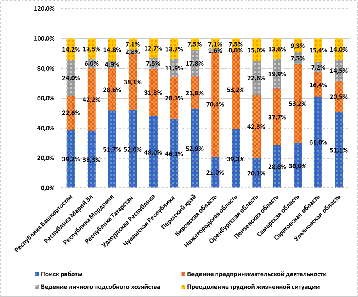 Стоит сказать, что в рамках данных, о заключенных социальных контрактах, отмечается достаточно сильная дифференциация как среди общей доли заключенных социальных контрактов в общей доле малоимущих, так и среди основных мероприятий, по которым заключаются социальные контракты в конкретном регионе [5]. Существующая дифференциация достаточно велика даже в рамках одного федерального округа. Так, в Приволжском федеральном округе (ПФО) не отмечается однородности по значениям показателей основных мероприятий, по которым были заключены социальные контракты (рисунок 1).