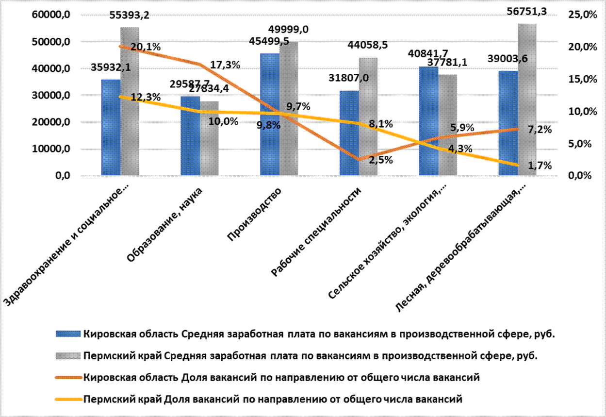 Существующая диспропорция может объясняться тем, что в 2023 году в Пермском крае, согласно данным единой цифровой платформы в сфере занятости и трудовых отношений «Работа в России», было размещено на 51,5% больше, чем в Кировской области, а средняя предложенная заработная плата по вакансиям была выше на 25,8%. Наибольшая доля вакансий в представленных областях была представлена в сферах здравоохранения и социального обеспечения, образования и науки, производства, сельского хозяйства и экологии, лесной, деревообрабатывающей, целлюлозно-бумажной промышленности, а также широко представлены были рабочие специальности. Примечательно, что уровень средней предлагаемой заработной платы по вакансиям практически во всех производственных сферах был выше в Пермском крае. В частности, по вакансиям в сфере здравоохранения и социального обеспечения он был выше на 54,2%, по рабочим специальностям на 38,5%, в лесной, деревообрабатывающей, целлюлозно-бумажной промышленности на 45,5% (рисунок 2).
