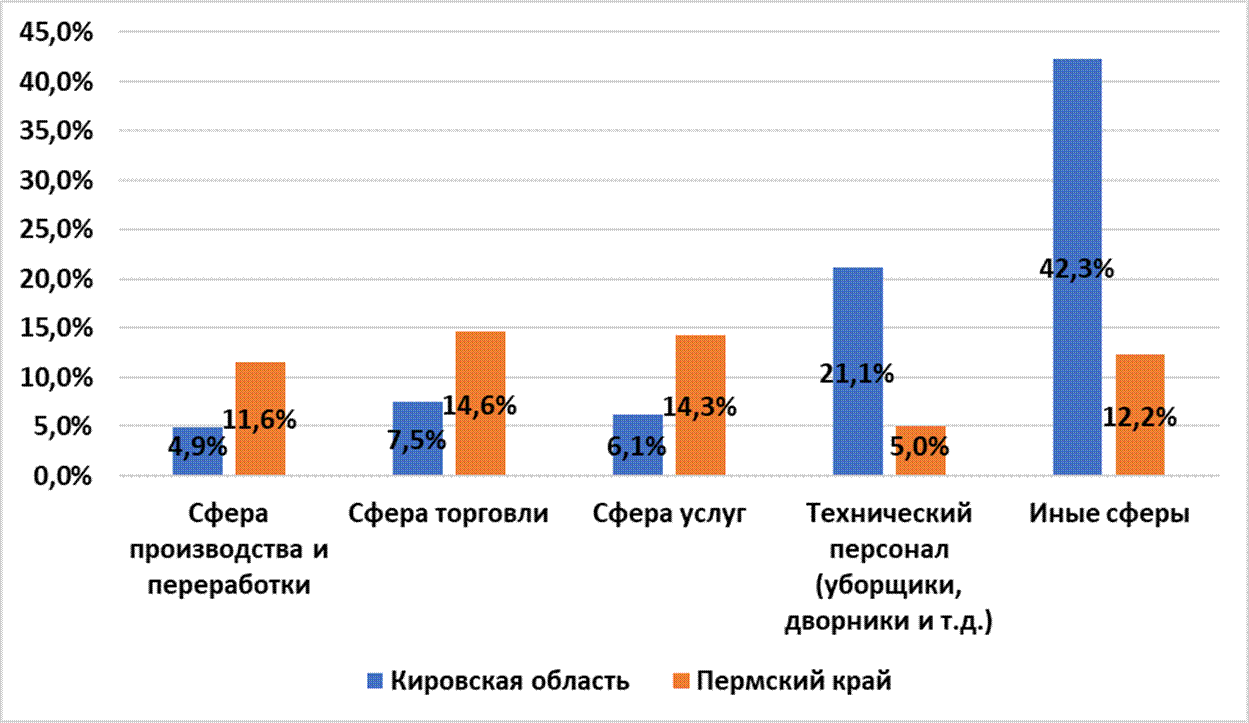 В Пермском крае большая часть малоимущего населения, заключившего социальный контракт трудоустроились в сферы торговли, услуг, производства и переработки, а также иные сферы деятельности, в то время как в Кировской области чуть более одной пятой от всех, кто заключил социальный контракт по основному мероприятию «поиск работы» трудоустроились в качестве технического персонала. Помимо этого, в Кировской области 42,3% трудоустроились в иные, не указанные, сферы деятельности. Так, нельзя сделать однозначного вывода о том, что малоимущие граждане, заключившие социальный контракт в 2023 году, трудоустроились в те отрасли, где наблюдалось наибольшее предложение [3]. Дисбаланс распределения населения в сторону сферы производства и переработки, торговли и услуг, особенно в Пермской области можно связать с тем, что данные отрасли не имеют особого порога для входа, а также в них занято достаточно большое количество населения в регионе, то есть они являются развитыми и актуальными. Так, в данных сферах занято порядка 37–40% трудоспособного населения, а заработная плата в них варьируется от 40 до 70 тысяч рублей.