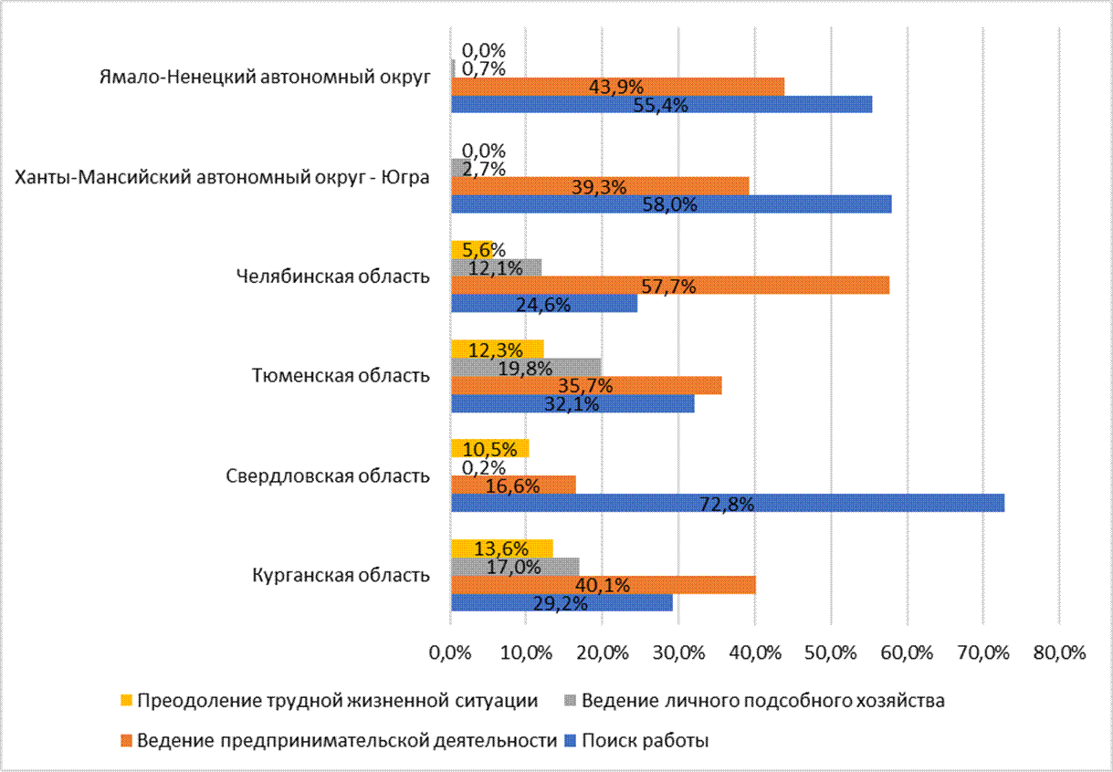 Также для объективности выводов можно рассмотреть распределение малоимущего населения, заключившего социальный контракт по различным мероприятиям в другом федеральном округе, например, Уральском (УрФО) (рисунок 4).