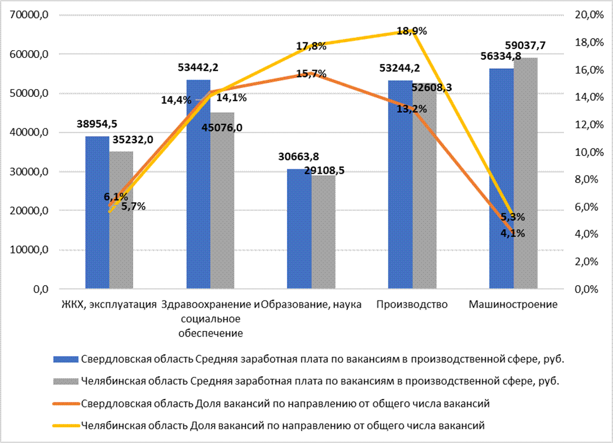 Так, в Свердловской области в наиболее распространенных производственных сферах уровень заработной платы выше, чем в Челябинской области. В сфере ЖКХ, эксплуатации на 10,6%, в здравоохранении и социальном обеспечении на 18,6%, в образовании, науке на 5,3%, в производстве на 1,2%. Лишь в сфере машиностроения уровень предлагаемых зарплат выше в Челябинской области – на 4,6%.