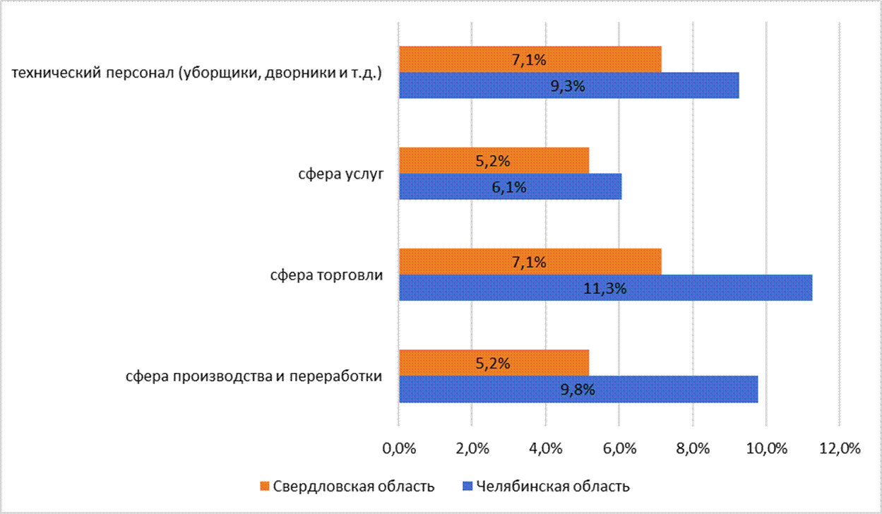 В рассматриваемых регионах также наблюдается значительная дифференциация выбора населения сферы производства среди населения, заключившего социальный контракт по основному мероприятию «поиск работы». Так, в Свердловской области 7,1% трудоустроились в сферу торговли и столько же — в качестве технического персонала, тогда как в Челябинской области эти показатели значительно выше: 11,3% в торговле и 9,8% среди технического персонала. Ещё более выражена разница в производстве и переработке: 5,2% в Свердловской против 9,8% в Челябинской области. При этом сфера услуг в обоих регионах остаётся менее популярной (5,2% и 6,1% соответственно).