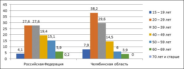 Рисунок 1 - Возрастная структура безработного населения в РФ, Челябинской области за 2023 г. (по данным выборочных обследований рабочей силы; в процентах к итогу)