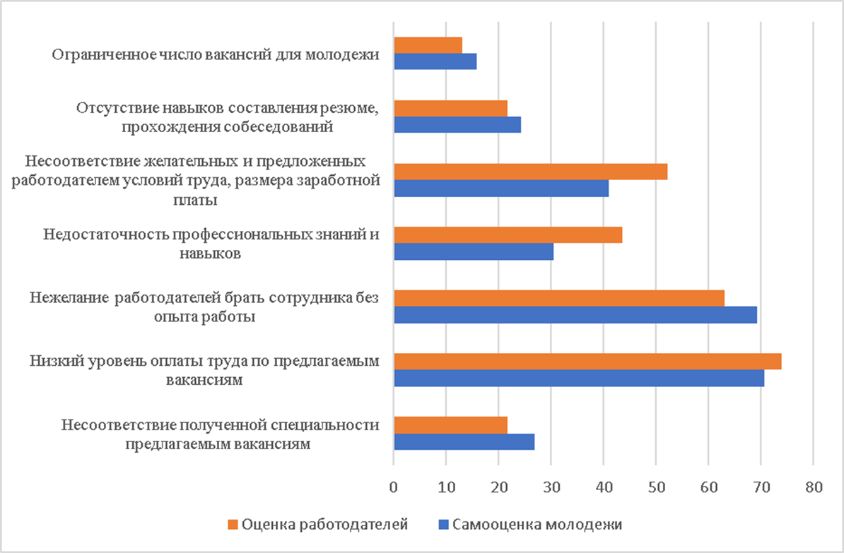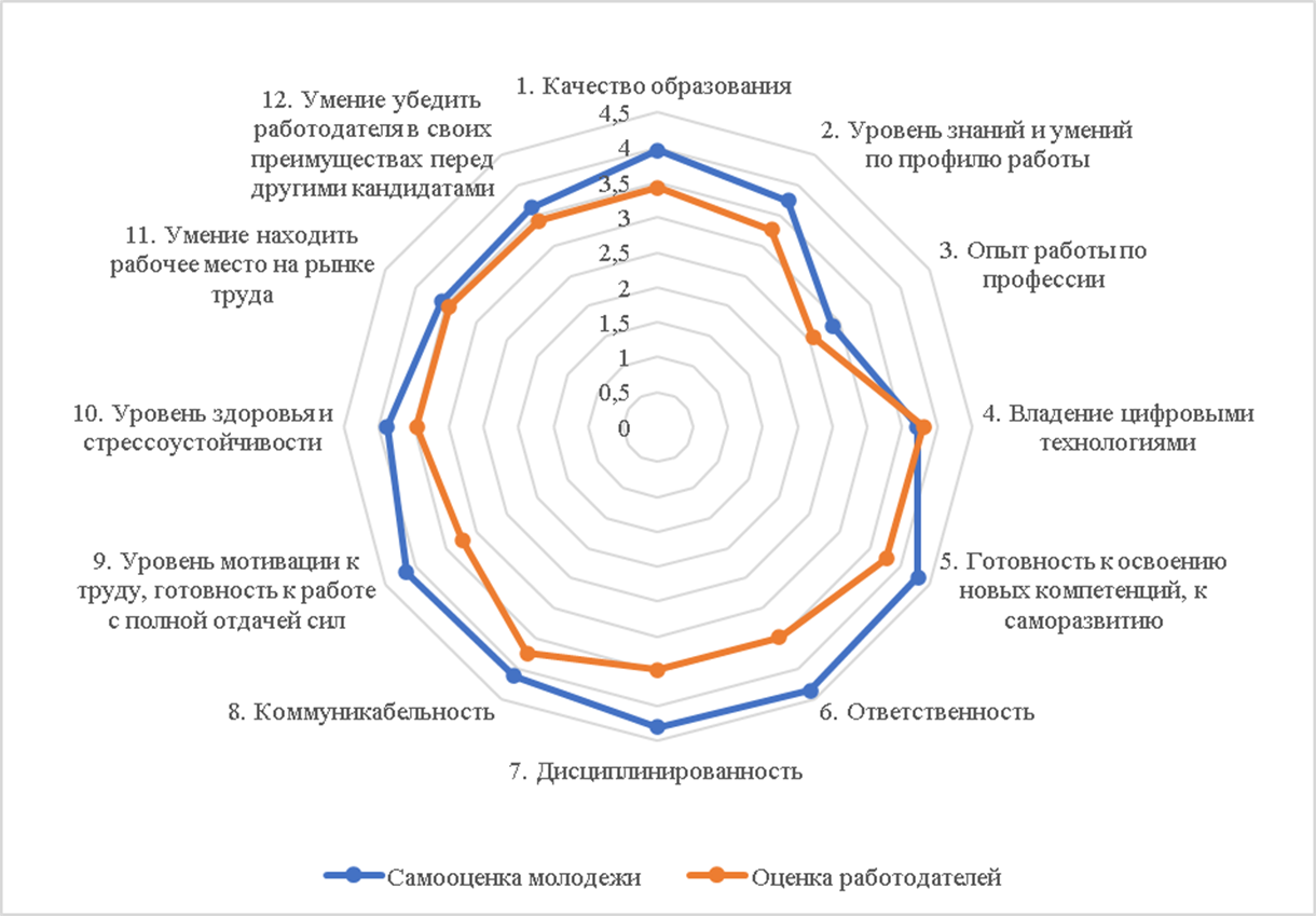 Результаты проведенного авторами социологического исследования показали, что молодежь испытывает ряд трудностей при трудоустройстве из-за: отсутствия опыта работы, низкого уровня оплаты труда по предлагаемым вакансиям, недостаточной базой профессиональных знаний и навыков поиска работы и прохождения собеседований. Со стороны представителей работодателей была дана оценка конкурентоспособных качеств молодежи, которые показали, что наиболее высоко работодатели оценивают владение молодыми людьми цифровыми навыками и умениями находить рабочее место на рынке труда и убедить работодателя в своих преимуществах, по сравнению с другими кандидатами. Тогда как такие важные характеристики, как качество образования, уровень знаний, умений, навыков, опыт работы по профессии, а также личные качества (ответственность, дисциплинированность, уровень мотивации) получили достаточно низкие оценки. Также в результате исследования было выявлено расхождение в оценках уровня конкурентоспособности молодежи работодателями и молодыми людьми, причем молодые люди оценили свой уровень более высоко. Это объясняет то, что работодатели склонны предлагать молодым людям определенные вакансии и невысокий уровень оплаты труда, а молодые люди, часто разочаровываются в трудовой деятельности и стремятся найти более комфортную и высокооплачиваемую работу.