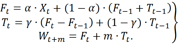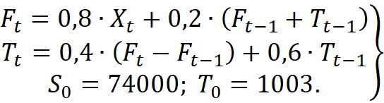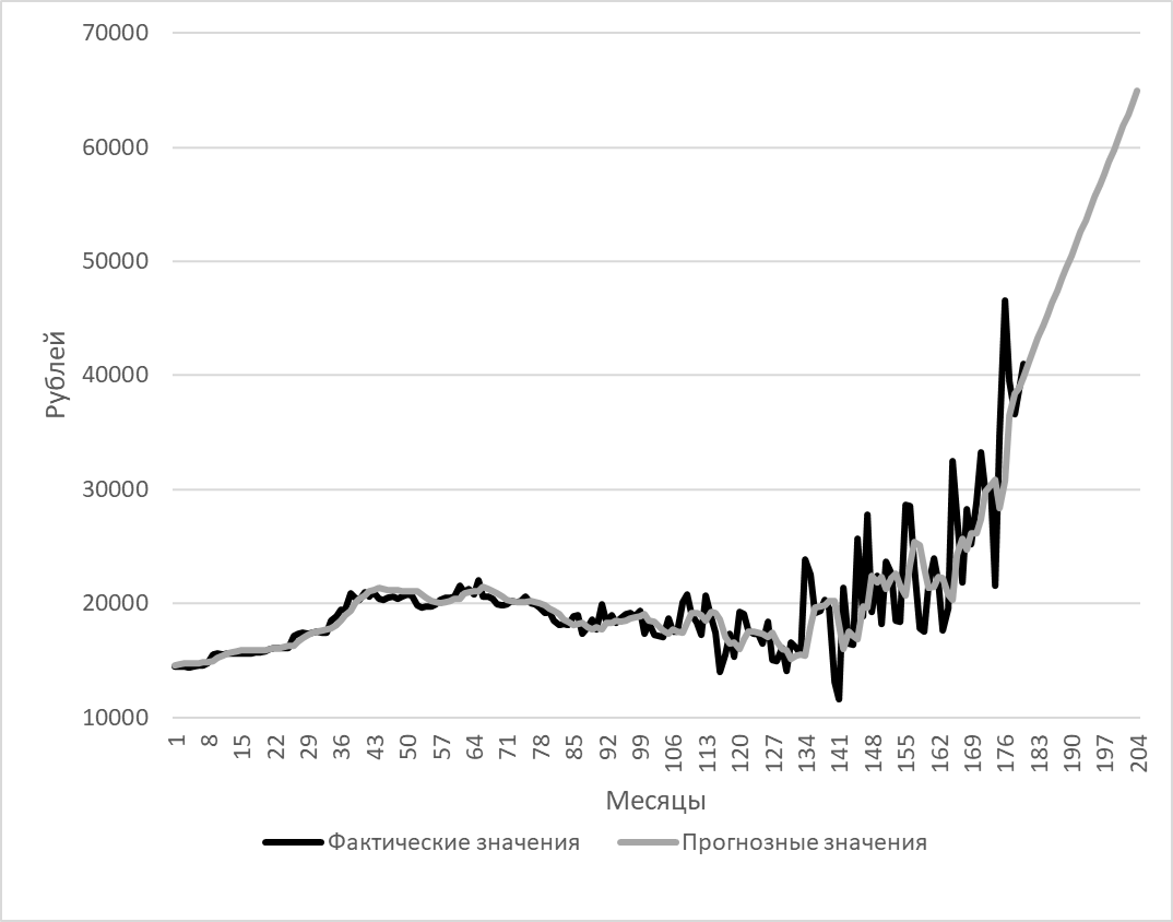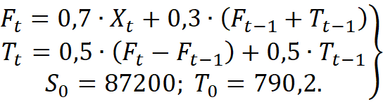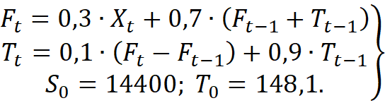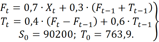 Модель двойного экспоненциального сглаживания Хольта с линейным трендом для показателя «средняя стоимость аренды однокомнатной квартиры в Санкт-Петербурге» имеет вид (α=0,3, γ=0,1):