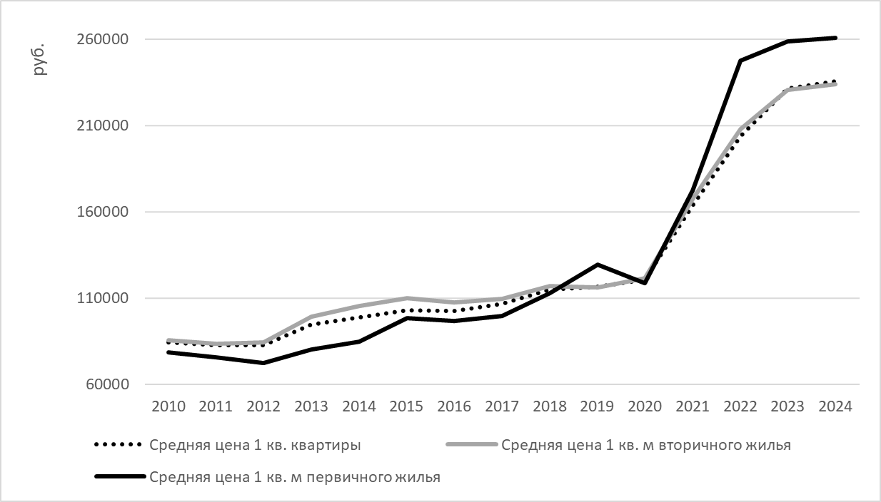 Статистический анализ показал, что с 2010 г. по 2024 г. в Санкт-Петербурге средние цены 1 кв. м квартир всех видов, и, в частности, вторичного жилья увеличились в 2,8 раза (квартир – с 84,5 тыс. руб. до 235,3 тыс. руб., вторичного жилья – с 85,8 тыс. руб. до 233,9 тыс. руб.), первичного жилья – в 3,3 раза (с 78,7 тыс. руб. до 260,7 тыс. руб.) (табл. 1).