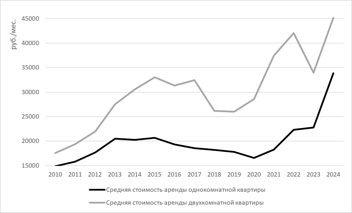 - аренда квартир становится все более недоступной для большинства граждан: стоимость аренды однокомнатной квартиры с 2010 по 2024 год выросла в 2,3 раза (со среднегодовыми темпами роста 106,1%), двухкомнатной – в 2,6 раза (со среднегодовыми темпами роста 107,0%), что значительно ухудшает уровень жизни населения;