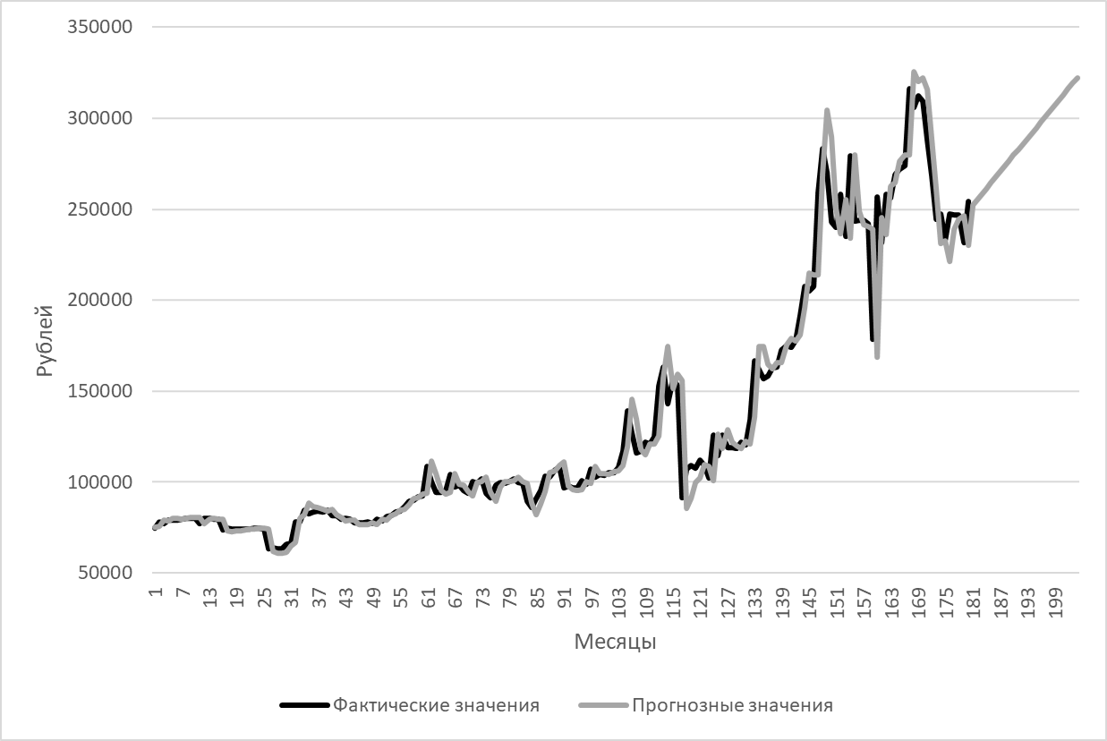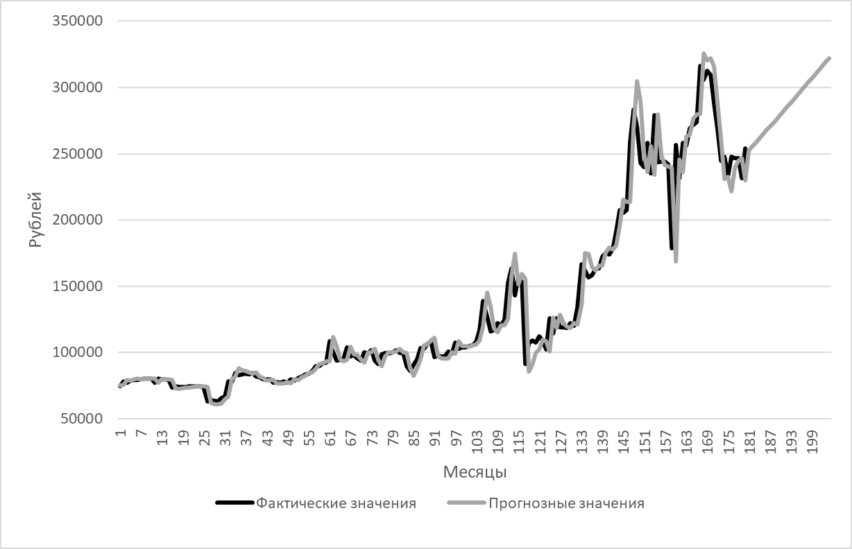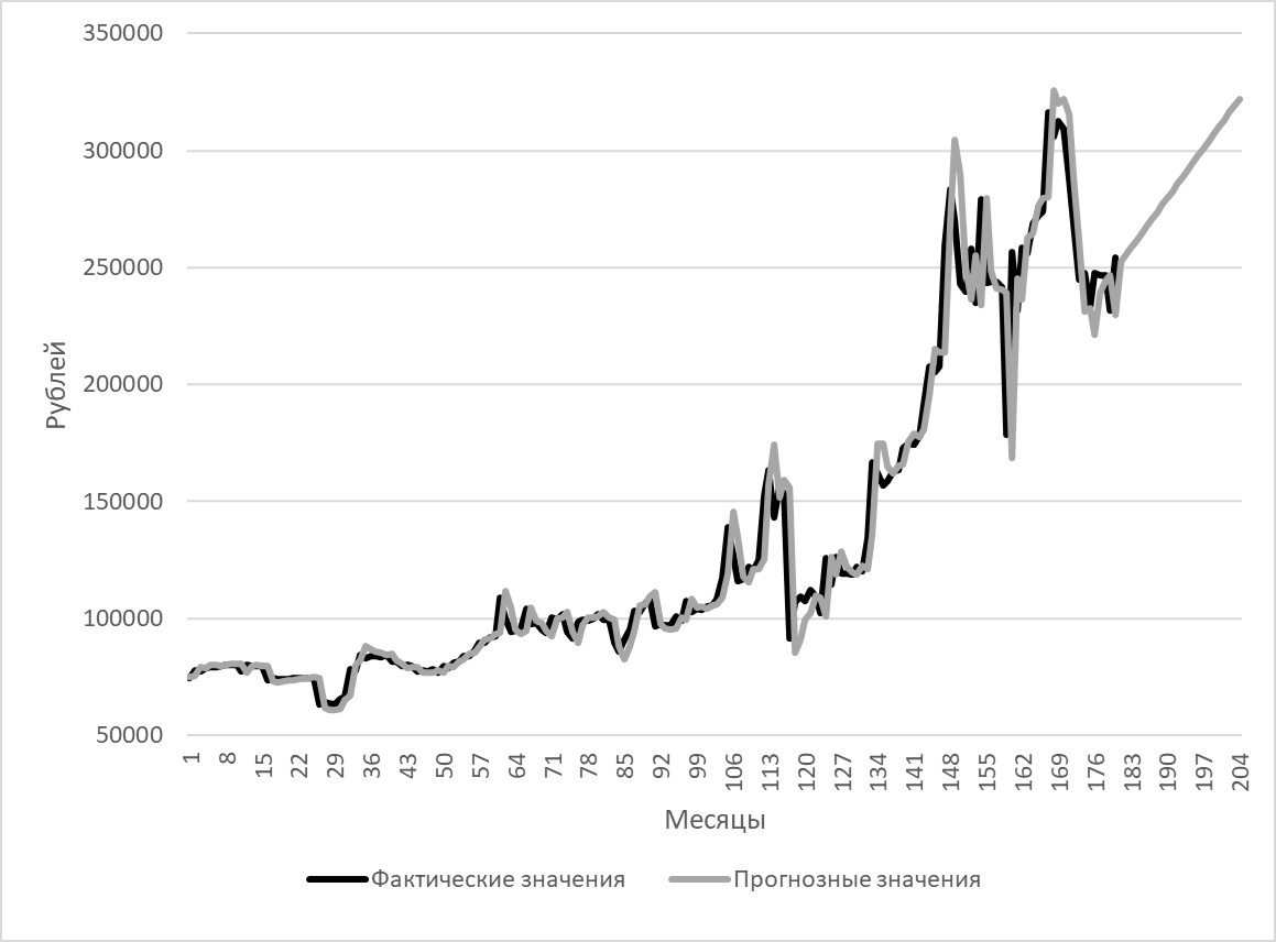 Для прогнозирования показателя «средняя цена одного квадратного метра первичного жилья в Санкт-Петербурге» использовалась следующая модель (α=0,8, γ=0,4):