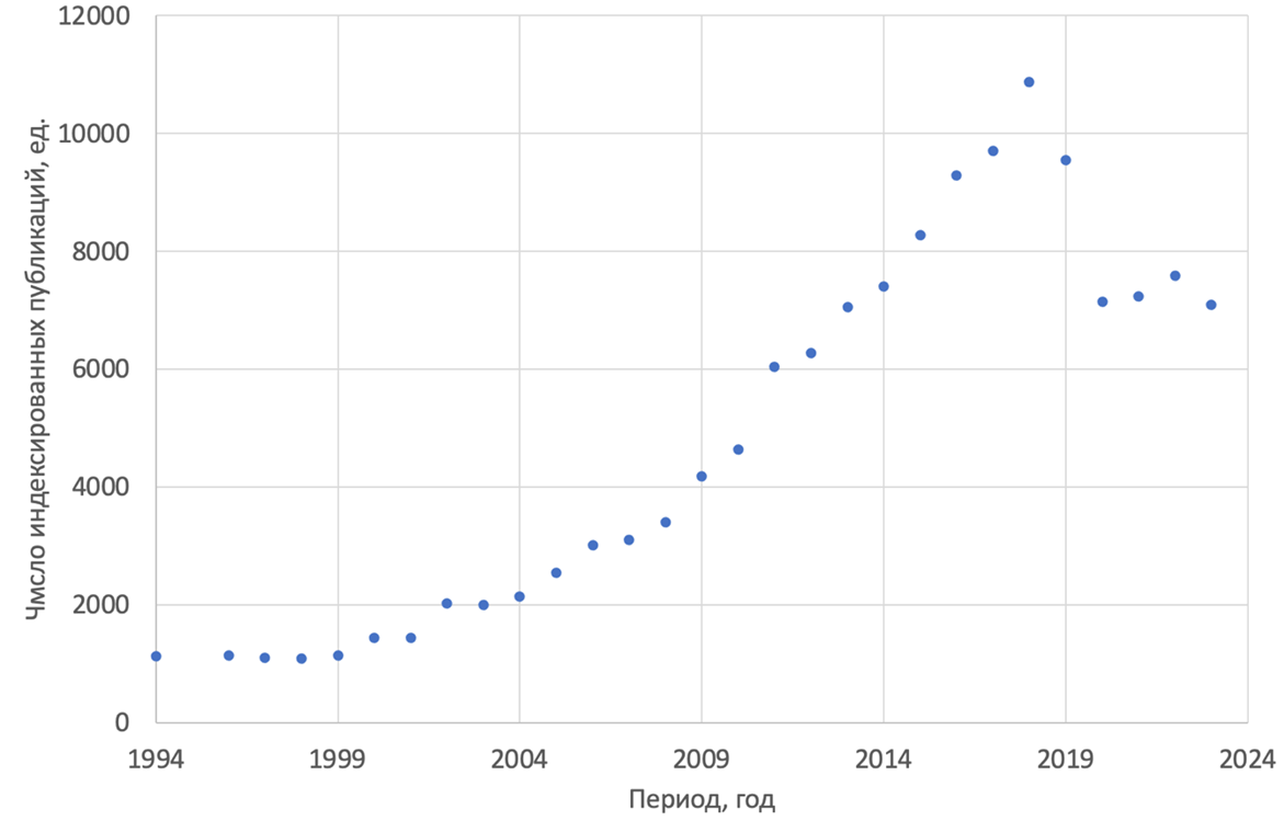 Библиометрический (количественный) анализ (автором использовался инструмент - OpenAlex) публикационной активности в ретроспективе 20-ти лет обнаруживает значительный интерес ученых к проблемам «инноваций в машиностроении». В базе данных Scopus на 2024 год индексировано 157300 публикаций, причем видна явная поступательная динамика роста научного интереса к проблемам экономического развития машиностроения на платформе инновационных драйверов (рис. 1), пик активности в 2018 году – 10873.