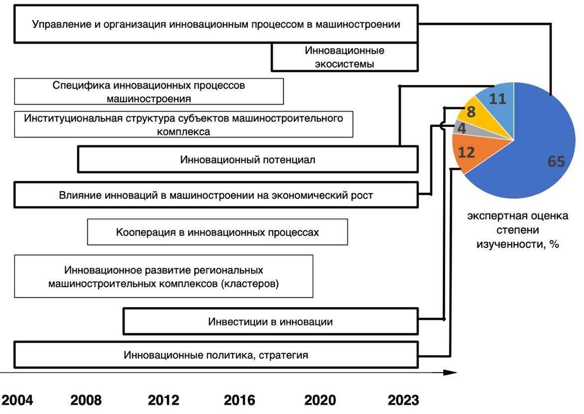Рис. 2 – Структура и периоды вопросов исследования экономики инноваций в машиностроительном комплексе. Выделено автором по библиографическому анализу 1322 диссертаций, защищенных в России в период 2004-2023 году (источник данных – библиотека Dissercat).