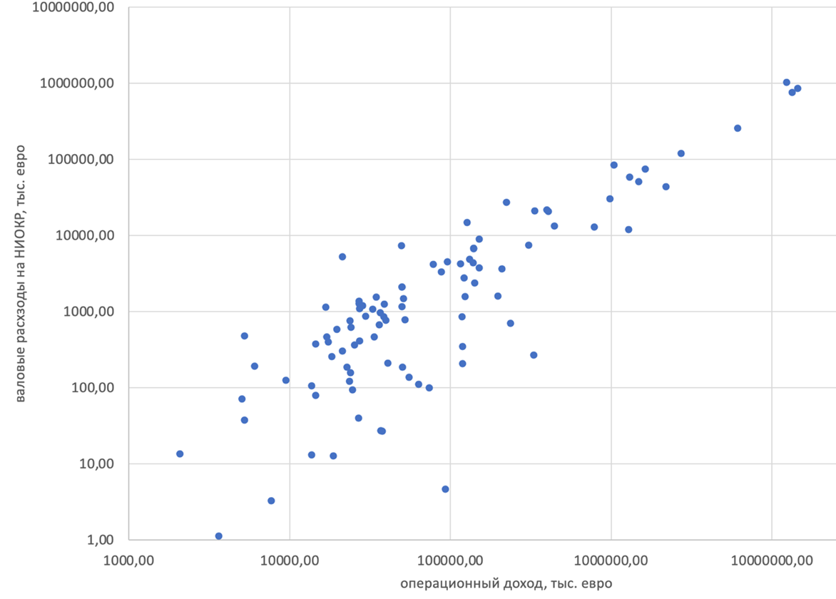 Экономический рост предприятий на основе инноваций c одной стороны является аксиоматическим тезисом (редко ставящимся под сомнение в научной дискуссии), а с другой – незавершенностью видения природы трансформации инновационных драйверов в экономический рост. В рамках первого тезиса, Асканова О. В. представила «…результаты определения степени тесноты связи между динамикой объема инвестиций (в НИОКР – автор) и отгруженной инновационной продукции» [3]. И с этим трудно не согласиться: построенное автором поле распределения (рис. 3) расходов на НИОКР и операционного дохода 109 машиностроительных предприятий явно обнаруживает практически линейный тренд. Аналогичные данные получены Праздновым Г.С. [21], Кропли Д. Х., Сингх К. [40] и другими учеными (табл. 2). Но вместе с тем (в рамках второй части тезиса) сохраняется вопрос о факторах, опосредующих инвестиции в НИОКР и экономический рост. С концептуальной точки зрения изучается вопрос «производственной функции» с фокусом на инновационный капитал (выступающий в функции Кобба-Дугласа только поправочным технологическим коэффициентом), трансформации интеллектуального капитала в операционные результаты хозяйственной деятельности.