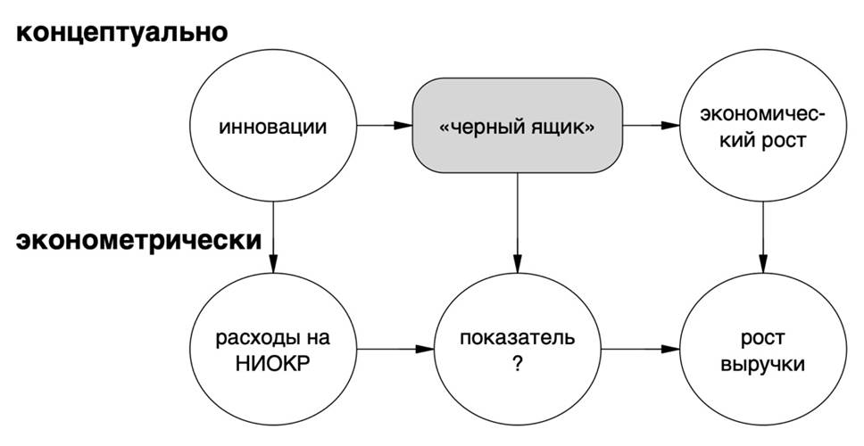 В рамках такой постановки задачи не очевидна прозрачность факторов, трансформирующих инвестиции в НИОКР в операционный доход: «… взаимосвязь между инвестициями в НИОКР и результатами их эффективности остается загадкой» (Карна А. и др. [45]). То есть, в настоящее время автором концептуально декларируется наличие «черного ящика» (рис. 4) во взаимосвязи инноваций и экономического роста, а эконометрически между величиной расходов на НИОКР и операционным доходов. Конечно, проблема «черного ящика» осознана в научной дискуссии по вопросу инновационного развития машиностроения и автором наблюдаются попытки ее решения. Так, Швиденко Н. и др. [50] искали ее решение через анализ «структуры проблематики экономического развития машиностроительного комплекса», Тебекин А.В. [46] через – «системные предпосылки экономического роста», а Празднов Г.С. [28] в «формулировке эконометрического контура инновационного развития машиностроительного предприятия».