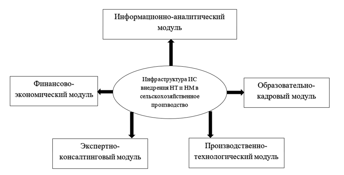 Запуск инновационного процесса внедрения нанотехнологий и наноматериалов в сельскохозяйственное производство предусматривает формирование адекватной структуры (ИС) с четким функционалом ее модулей, обеспечивающим взаимодействие структурных единиц между собой.