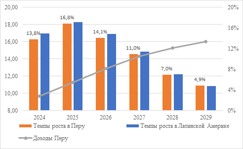 Рис.3. Эволюция размера рынка электронной коммерции в Перу (в млрд долл. США) и сравнение с регионом Латинской Америки в 2017-2029 гг.
