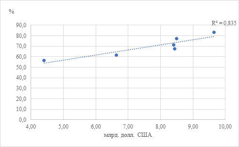 На сегодняшний день наиболее значимым фактором роста электронной коммерции в Перу является проникновение интернета. По данным Statista в 2024 году активными пользователями интернета являются примерно 83% населения [27]. Коэффициент корреляции между двумя этими величинами составил 0,9, а коэффициент достоверности аппроксимации – 0,8 (рис.5).