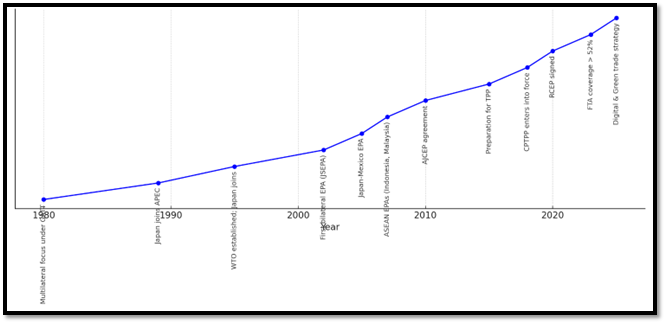 Over the past four decades, Japan’s trade policy has undergone a significant evolution, reflecting both structural changes in the global economy and the country’s shifting strategic priorities. Initially anchored in multilateral institutions such as the General Agreement on Tariffs and Trade (GATT) and its successor, the World Trade Organization (WTO), Japan maintained a cautious stance toward preferential trade agreements, prioritizing non-discriminatory liberalism and export-led industrial growth [20]. However, as regionalism proliferated across East Asia in the late 1990s and early 2000s, Japan gradually reoriented its trade strategy to incorporate bilateral and eventually mega-regional frameworks [6].