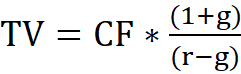 Следовательно, денежные потоки в постпрогнозный период будут оцениваться по модели Гордона, которая предполагает, что компания будет генерировать денежные потоки с постоянным темпом роста в течение неопределенного времени. Для расчета терминальной стоимости по данному методу используется формула (3):