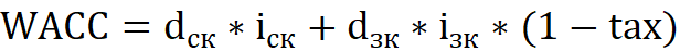 Кроме того, необходимо отметить, что для правильной оценки компании с учетом временной стоимости денег следует определить ставку дисконтирования. Эта ставка выступает в качестве коэффициента, который отражает ожидаемую прибыльность инвестиций с учетом рисков, связанных с будущими денежными потоками. В данной работе мы будем использовать средневзвешенную стоимость капитала (далее – WACC) в качестве ставки дисконтирования, поскольку компания располагает значительными объемами как собственного, так и заемного капитала, что делает данный подход целесообразным для учета всех связанных рисков (формула (6):