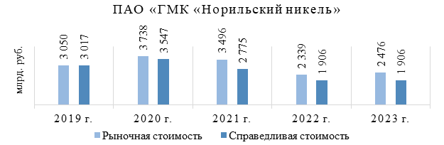 Рисунок 1 – Справедливая и рыночная стоимости ПАО «ГМК «Норильский никель»