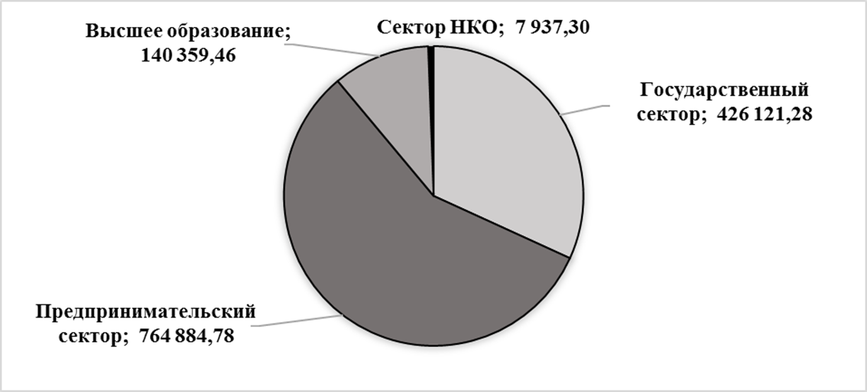 Рисунок 1. Распределение внутренних затрат на НИР, по источникам финансирования, средние значения за период 2019 – 2023 г., млн. руб.