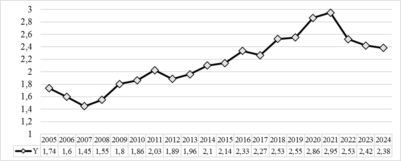Как видно, межрегиональная дифференциация по данному показателю возрастала за весь период, с кратковременными эпизодами стремления к конвергенции. Исключениями являются начальный период с 2005 г. по 2007 г., и последний период – с 2022 г. по 2024 г. При этом, к концу исследуемого периода коэффициент вариации возрос до 2,38, с 1,74 в 2005 г.