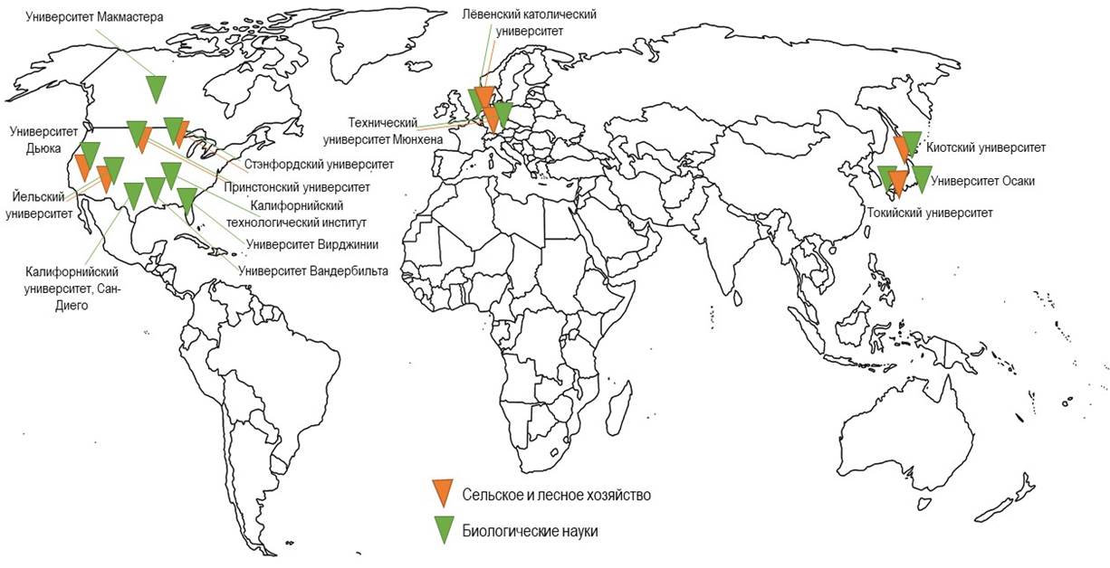 [1] для включения в картограмму отобраны образовательные организации, лидирующие в области наук о жизни (сельское и лесное хозяйство; биологические науки) в 2025 году и набравшие 100 баллов по показателю “Industry” (World University Rankings by Subject 2025: Life Sciences)