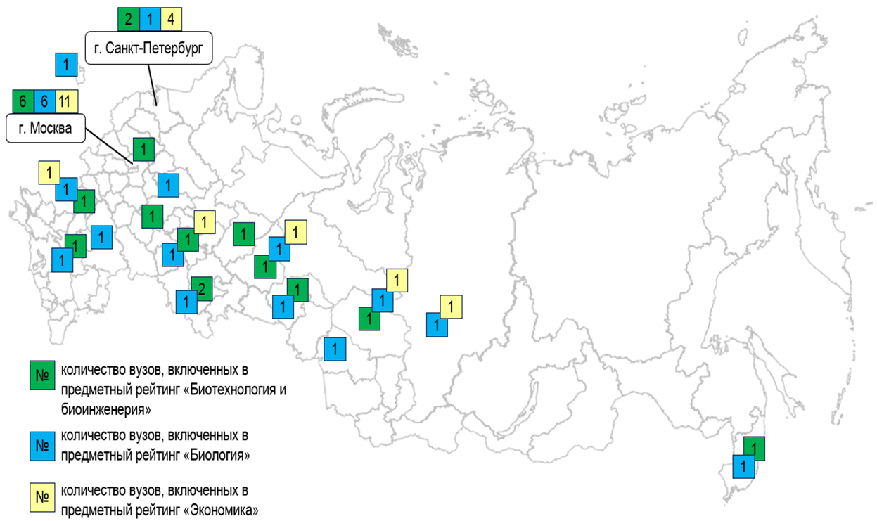 По данным рейтингового агентства “RAEX” [7] наибольшая часть образовательных организаций, лидирующих в предметных рейтингах «Биотехнология и биоинженерия», «Биология», «Экономика» сосредоточена в городах федерального значения – Москве и Санкт-Петербурге (рис. 2).