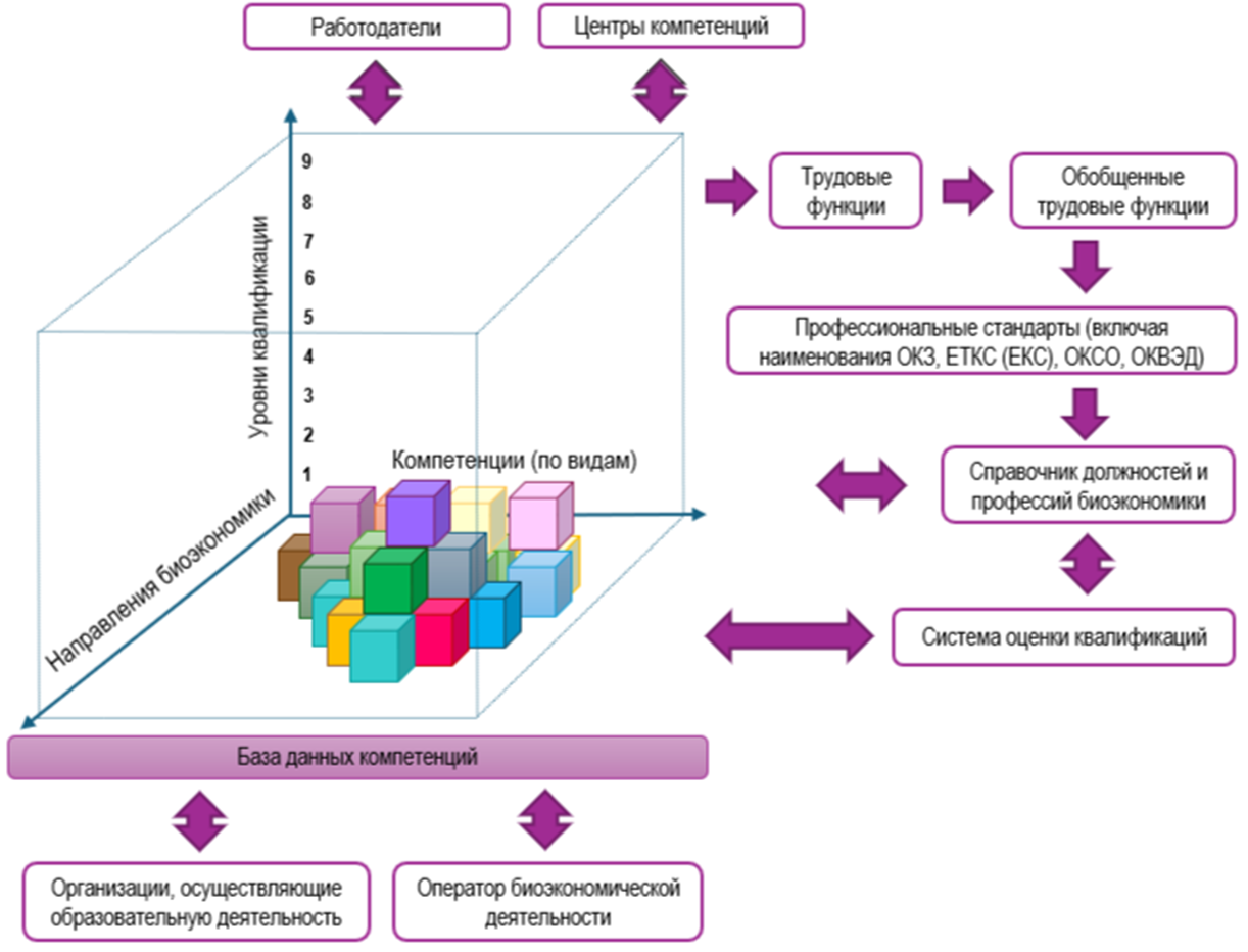 С целью обеспечения искомой гармонизации системы подготовки кадров для биоэкономики база данных компетенций может стать цифровым решением при организации связок с видами экономической деятельности (ОКВЭД), Общероссийским классификатором занятий (ОКЗ), общероссийским классификатором занятий (ОКЗ), единым тарифно-квалификационным справочником работ и профессий рабочих (ЕТКС (ЕКС)).