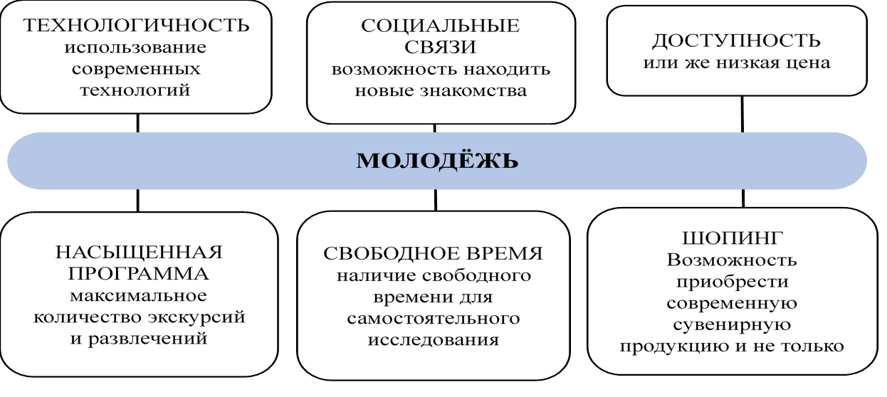 Следует отметить, что в тексте закона нет упоминания о молодежи как о отдельной категории потребителей туристических услуг, а также о молодежном туризме как специфическом секторе. Эта тема затрагивается в другом федеральном документе – «Стратегия развития туризма в Российской Федерации на период до 2035 года» [10]. В данном документе определён возрастной интервал для молодежного туризма, составляющий от 18 до 35 лет.
