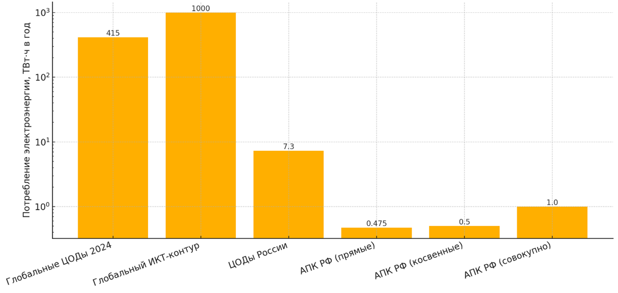 Сегодня в АПК транслируется измеримый энергетический и углеродный след отрасли (рисунок 2). С позиции прямых затрат на электроэнергию базовым ориентиром служит энергопотребление дата-центров: Международное энергетическое агентство оценивает, что в 2024 г. глобальные ЦОДы израсходовали около 415 ТВт·ч, то есть ≈ 1,5 % всей производимой в мире электроэнергии, с прогнозом роста почти вдвое к 2030 г. [44]. Более широкий ИКТ-контур (сети, устройства, передача) уже приближается к 1 000 ТВт·ч / год [46].