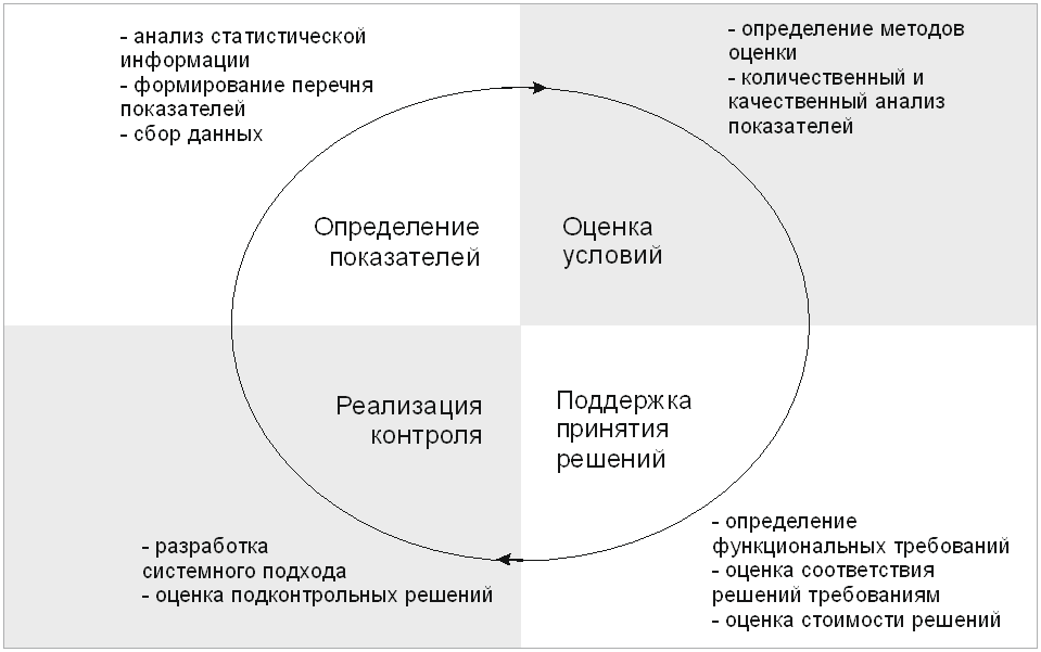 В рамках методологических аспектов оценки базовых условий развития умных городов, нами выделены четыре этапа: определение показателей, оценка условий, поддержка принятия решений, реализация контроля (рис. 1) .