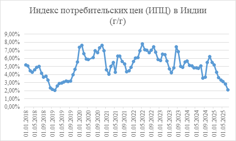 Рисунок 1. Изменение динамики индекса потребительских цен в Индии с 1 января 2018 года по 14 июля 2025 года