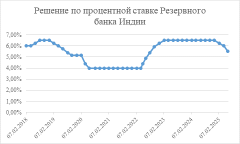 Рисунок 2. Изменение динамики ключевой процентной ставки Резервного банка Индии с 1 января 2018 года по 6 июня 2025 года