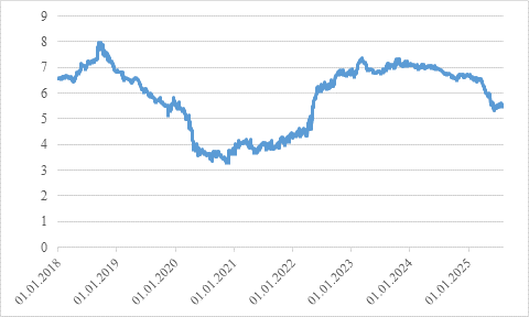 Рисунок 3. Изменение динамики доходности облигаций Индии (в %) с 1 января 2018 года по 1 августа 2025 года