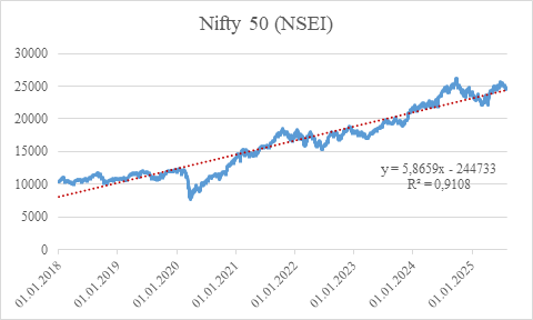 Figure 4. Changes in the dynamics of the Nifty 50 Stock Index (NSEI) from January 1, 2018 to August 1, 2025