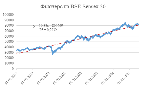 Рисунок 5. Изменение динамики биржевого индекса Фьючерс на BSE Sensex 30 с 1 января 2018 года по 1 августа 2025 года