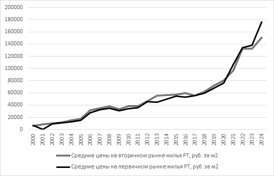 Величина стоимости квадратного метра недвижимости по Республике Татарстан растет. В период 2012-2016 стоимость квадратного метра на вторичном рынке была выше чем на первичном. Покупатели платили за отсутствие риска, связанного банкротством застройщика. С введением эскроу-счетов, когда строительство финансируется за счет кредитных средств, ситуация изменилась: цена на новостройки стала превышать стоимость жилья на вторичном рынке. В связи с ростом ключевой ставки разрыв в цене квадратного метра на первичном и вторичном рынке растет.