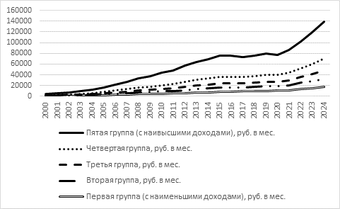 Не каждый гражданин обладает доходами достаточными для покупки объекта жилой недвижимости. Поэтому целесообразно разделить население по уровню дохода и рассмотреть какие возможности для инвестирования имеются у каждой категории населения. На рисунке 2 представлена динамика доходов населения по 20-ти процентным группам населения.