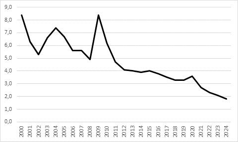 На рисунке 4 представлена динамика безработицы в Татарстане. Наблюдается устойчивая тенденция к снижению числа безработных граждан. Если в 2009 году было 8,4 % безработных граждан, то в 2024 году их только 1,8 %. Снижение доли безработных означает рост числа потенциальных покупателей недвижимости и рост спроса.