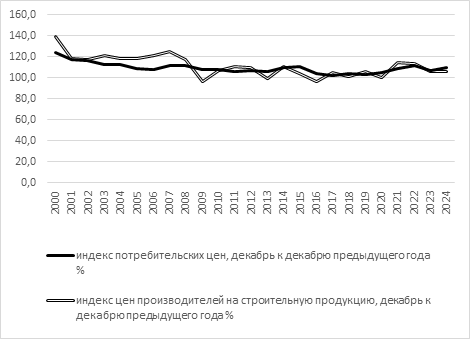 Рис. 5. Динамика индекса потребительских цен и индекса цен на строительную продукцию по Республике Татарстан.