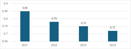 Рисунок 1. Усредненная динамика коэффициента частоты травматизма с потерей трудоспособности LTIFR (на 1 млн. чел.-час.) на предприятиях ГМК России (2021-2024 гг.) (составлено авторами на основе анализа [3, 16, 17]).