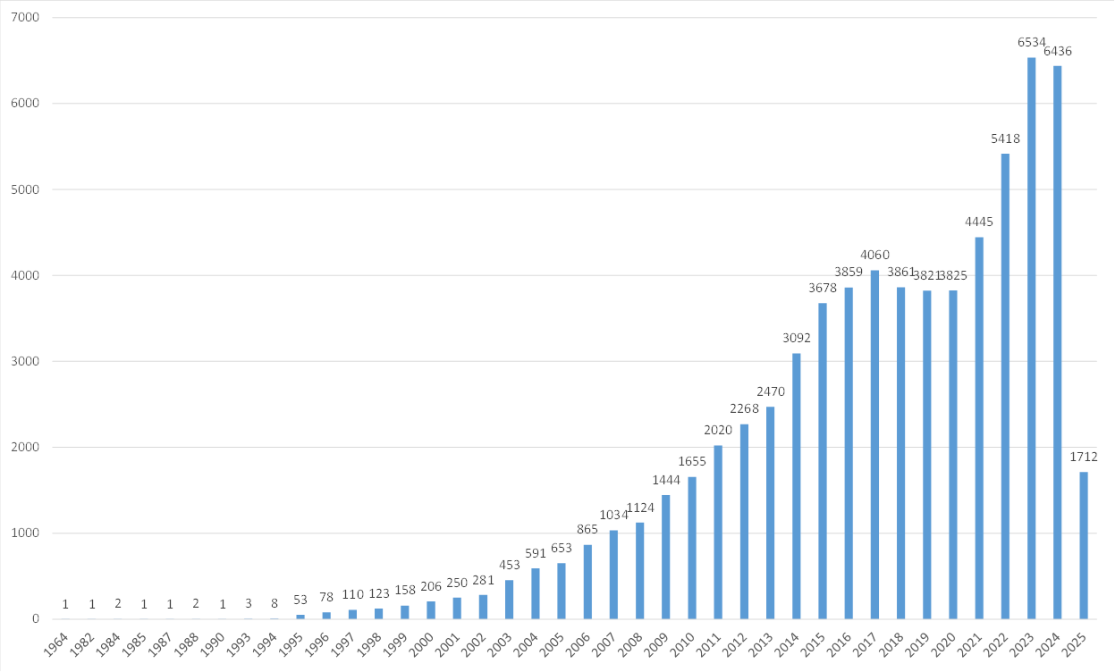 За последние несколько десятилетий популярность концепции устойчивого развития резко возросла. Об этом свидетельствует и рост числа научных исследований, в которых устойчивое развитие рассматривается как основная тематическая область. Так, по поисковому запросу «устойчивое развитие» на портале ELIBRARY.ru на 12 августа 2025 г. можно обнаружить 306255 публикаций из 72688645, из них рассматриваемый термин встречается в названии 66608 публикаций. Если проанализировать динамику числа публикаций, в названии которых содержится термин «устойчивое развитие» (рис. 1), то можно отметить, что пик исследовательского интереса к данному концепту приходится на 2023 и 2024 год (6534 и 6436 публикаций соответственно). Причем если сравнить это число публикаций, с данными на 2000 г. (206 публикаций), то можно отметить, что интерес исследователей к тематике устойчивого развития увеличился более чем в 30 раз.