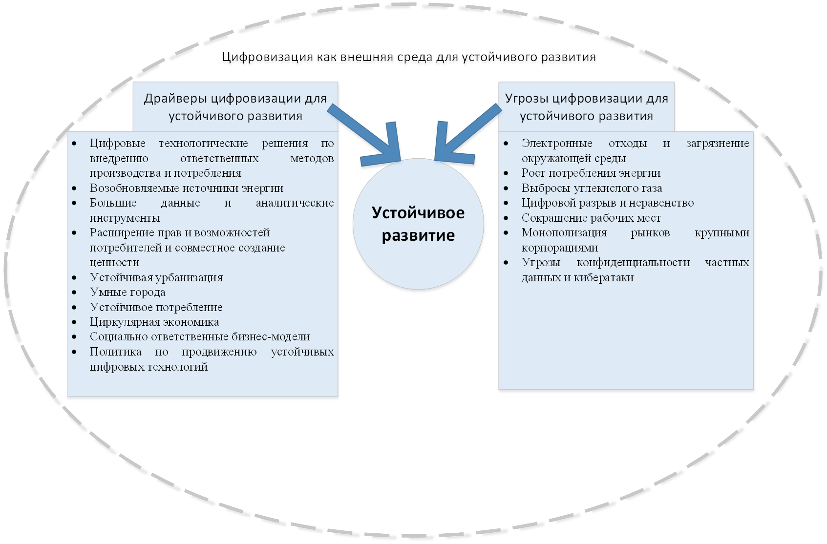 На наш взгляд, цифровизация выступает в качестве своеобразной внешней среды для устойчивого развития социально-экономических систем, в рамках которой устойчивое развитие сталкивается с рядом угроз, а также приобретает и новые драйверы для дальнейшего роста.